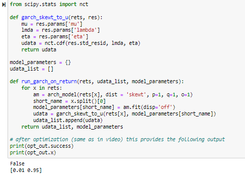 First of all many thanks for your video. I also had a look at your PhD, which has been very helpful for my own MSc thesis. I am currently struggling with adapting your code to implement a skewed student’s t distribution for a DCC-GJR GARCH model. With the help of the previous replies, I came up with the following code. However, the optimization procedure does not work.